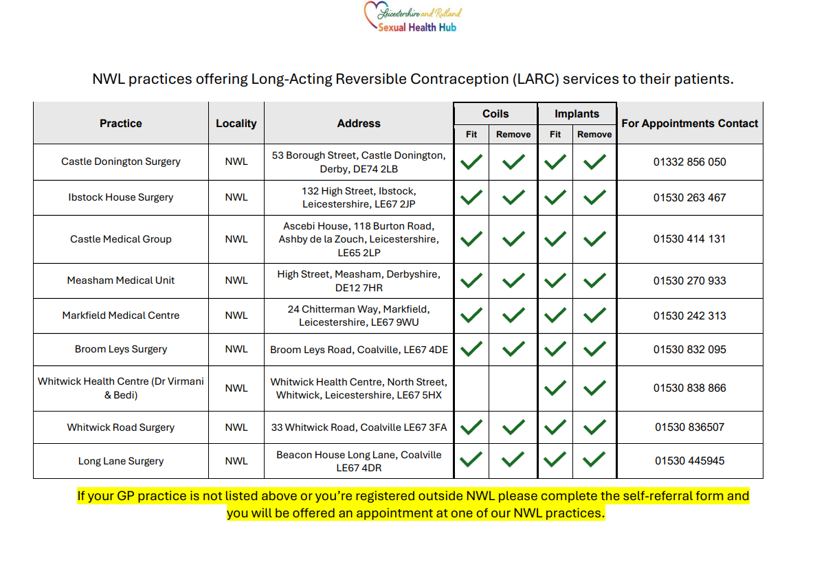 The following NWL practices offer Long-Acting Reversible Contraception (LARC) services to their own practice patients.